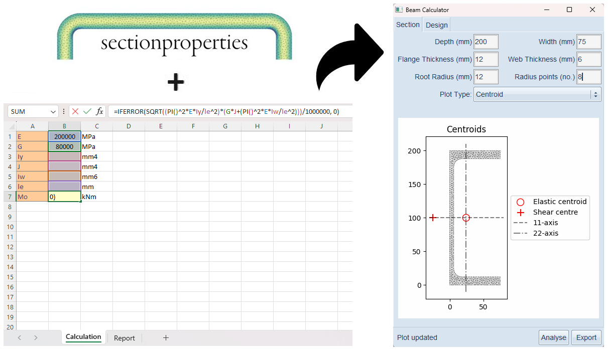 This post is aimed to provide a concrete example of how this can be achieved and how you can transform your engineering analysis with this powerful, integrated solution. By following steps below, you would have a working app, as per screenshots below, which calculates the “reference buckling moment (Mo)” of a PFC section as per AS4100-2020. However, please note that this procedure can be similarly applied to any complex section such as light gauge steel sections.